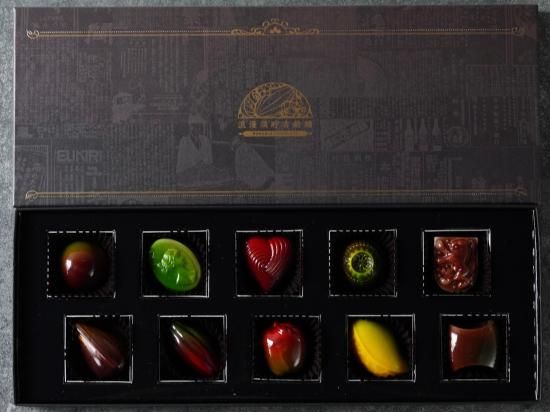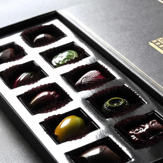 様々な産地のカカオ豆から自社工房内で作ったチョコレート。そちらを使用した美しい一粒サイズのボンボンショコラ。中には鮮烈な味わいのガナシュ(生チョコ)が詰まっています。